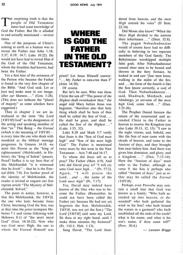 Cette idée n’est pas nouvelle au sein de WCG. Dans l’article de Garner Ted Armstrong : Qui – Quoi – Était Jésus Avant Sa Naissance Humaine ? (Good News, Novembre/Décembre 1972 pp. 14-16), le Dieu de l’Ancien Testament est dépeint comme étant Jésus Christ, et il a déclaré que le mot Yahovah dans l’Ancien Testament n’est pas Dieu le Père, mais est toujours Jésus Christ. Ces déclarations sont mal informées. Ils ne semblent se rendre compte que le mot Yahovah s’applique à un certain nombre d’êtres et qu’il y avait deux applications de Yahovah. Lorsque Yahovah des Armées est utilisé, il se réfère toujours au Père. Yahovah (SHD 03068) peut se référer à n’importe quelle personne qui est un messager de Dieu. Il s’agit d’une forme à la troisième personne du verbe Hayah, qui signifie Il Cause que ce soit (voir la note f de la version Annotée de la RSV (New Oxford Annotated Bible RSV) à Exode 3:14). Tel que discuté, il y en avait quatre mentionnés dans Genèse 18-19 lors de la destruction de Sodome et Gomorrhe. L’autre mot pour Dieu est Yahovih (SHD 03069). Il est toujours lu par les Juifs comme Elohim et le mot Yahovah est lu comme Adonaï afin de ne pas confondre les deux entités. Yahovih désigne le Père.