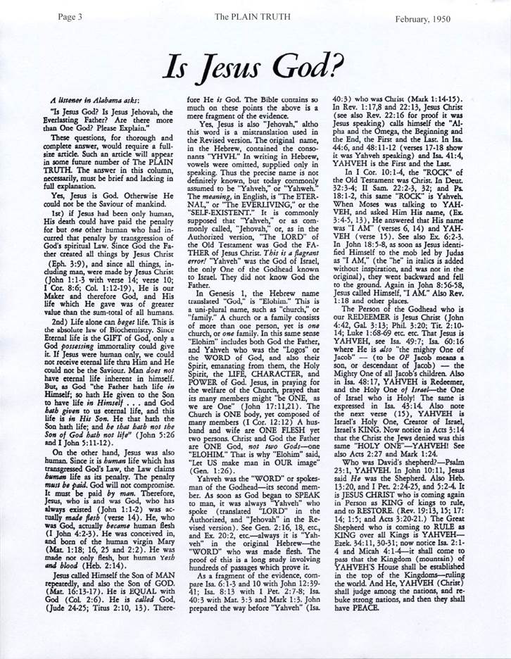 - Jésus est-il Dieu ? (The Plain Truth, Volume XV, Numéro 1, Février 1950)