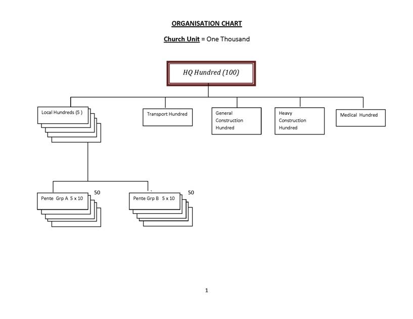 1.2.3.1. Chaque unité doit être divisée en dix sous-unités de l’unité familiale. Celles-ci seront connues en tant qu’Églises Locales. En règle générale, une sous-unité d’église sera composée d’environ 100 hommes valides et de leurs familles et des personnes âgées de la région. Cela était connu sous le nom d’une centaine dans les anciens temps anglo-saxons et les Centaines devinrent la base du système de Comté. Une “Centaine” est essentiellement synonyme d’une paroisse et a son origine dans les centaines bibliques de cette législation.