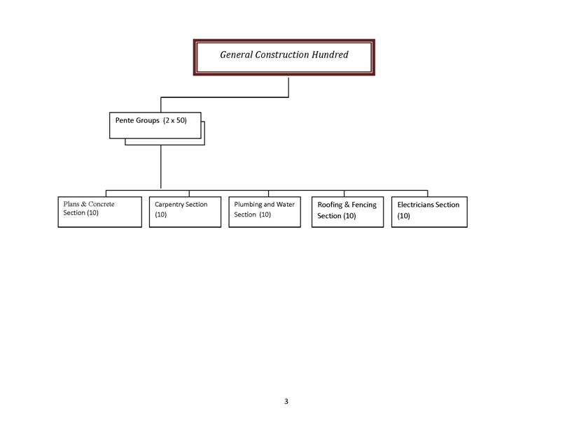 1.2.2. Chaque mille doit être reconnu comme un ‘eleph ou une unité familiale à des fins opérationnelles. Ceci dérive du mot hébreu pour bœuf ou famille et aussi le chiffre pour 1000. Les unités seront normalement formées de districts et de cantons. Elles doivent être connues sous le nom de ce district/sous-district ou son identifiant d’unité alloué, par exemple, l’Unité Familiale “x”. L’organisation de l’Unité est à l’Annexe 1. C’est en fait une agrégation de Centaines ou de paroisses qui forment une unité de base de comté.