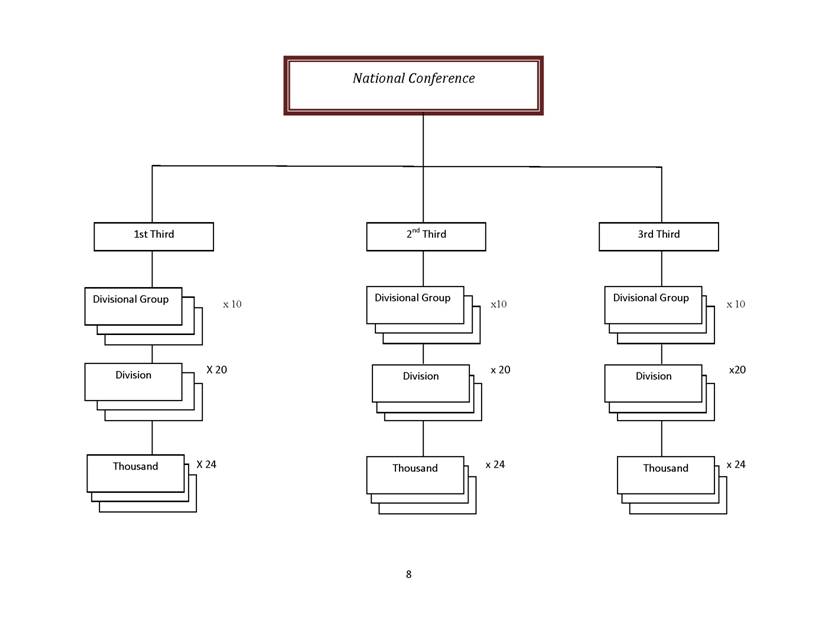 1.1.1. Ainsi, à partir de l’exemple de l’écriture, chaque Conférence Nationale comme elle en est capable doit constituer, sous l’administration de son conseil, la structure organisationnelle des capitaines de milliers.