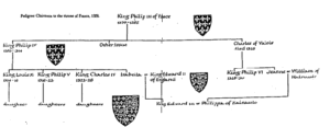 Les revendications sur la France sont venues d’Édouard III dont la mère était Isabelle, fille de Philippe IV (1285-314) et sœur des Rois Louis X (1314-1316), Philippe V (1316-1322) et Charles IV (1322-1328).