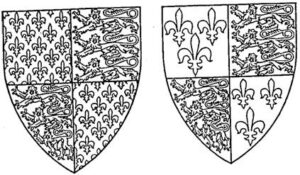 La lignée royale anglaise revendique, à partir d’Édouard III, un intérêt pour les domaines français à la mort de Charles IV en 1328, mais, pour des raisons de circonstances, elle perd l’initiative au profit de Philippe de Valois, qui est couronné Phillip VI. En 1337, Phillip a déclaré la Gascogne confisquée et, en octobre de la même année, Édouard a officiellement revendiqué la Couronne Française et fait écarteler ces armes avec les siennes, marquant ainsi le début de la guerre de 100 ans. Comme la France était le royaume le plus ancien, les Lys connus sous le nom de France Ancienne étaient marqués en première et quatrième position ; et les Léopards d’Angleterre en deuxième et troisième position (voir Figure 1). Les Blasons/Armoiries de la France sont passés de la France ancienne aux trois Fleurs de Lys, connues sous le nom de France Moderne, soit par Charles V en 1376, soit en 1394. Il a fallu attendre qu’Henri IV monte sur le trône d’Angleterre en 1399 pour que les Blasons/Armoiries royales soient modifiés en conséquence. Son premier sceau était simplement celui de son prédécesseur, mais le second Grand Sceau, découpé vers 1406, montre la France Moderne et l’Angleterre Écartelée. (Rodney Dennys, Heraldry and the Heralds, p.100, Cope, Londres, 1982).